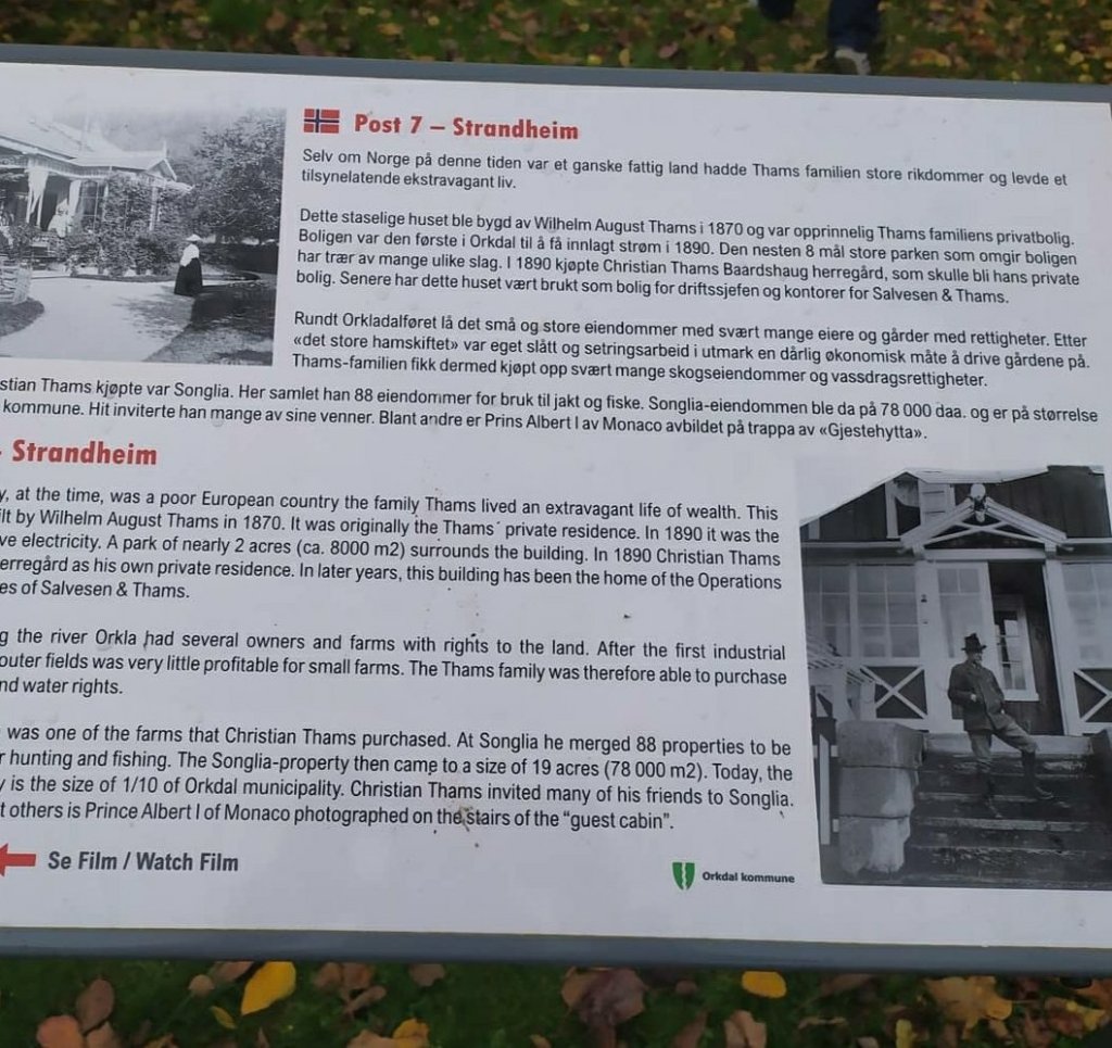 Songlia je bila jedna od farmi koje je Christian Thams kupio. U Songliji je spojio 88 imanja, koja su se koristila za lov i ribolov. Danas, to imanje iznosi 1/10 veličine Orkdal komune. Christian Thams je pozvao mnoge svoje prijatelje u Songliu, medju kojima je bio i Princ Albert Prvi od Monaka, uslikan na stepenicama „gostinske kolibe“.