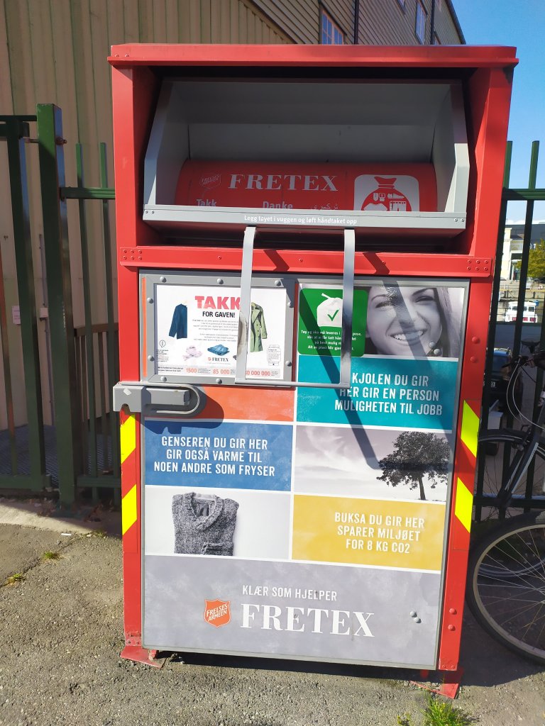 Vojska spasa je globalni pokret s opseΕΎnim druΕ‘tvenim opredeljenjem. U preko 130 zemalja, tako reΔi nude „supu , sapun i spas“ kako bi zadovoljili fiziΔke, mentalne i duhovne potrebe ljudi. Fretex doprinosi da ljudi dobiju i zadrΕΎe posao i doprinose boljoj ΕΎivotnoj sredini , izmeΔu ostalog, ponovnom upotrebom i recikliranjem. Vizija Fretexa je dati ljudima razlog da veruju u buduΔnost. Njihove glavne temeljne vrednosti su otvorenost, ljubav, predanost i profitabilnost. U jednoj od njihovih radnji, naΕ‘la sam zaista pravo blago. To je za mene bio vremeplov! Od muziΔkih ploΔa i gramofona, preko porcelanskih Ε‘oljica za kafu i servisa za ruΔavanje, satova, Ε‘eΕ‘ira, obuΔe, knjiga na raznim jezicima, do odliΔno oΔuvanih komada mnogih svetskih brendova. Prosto vas mami da ostanete Ε‘to duΕΎe i istraΕΎujete! Primetila sam jednu veliku razliku od odlaska u butike koriΕ‘Δene robe u Srbiji i u NorveΕ‘koj , a to je da kod nas ljudi ulaze u radnje pomalo srameΕΎljivo dok je ovde to potpuno normalno i veoma popularno! Ispred radnje se nalazi i kontejner u koji moΕΎete ubaciti stvari koje vam viΕ‘e ne trebaju.